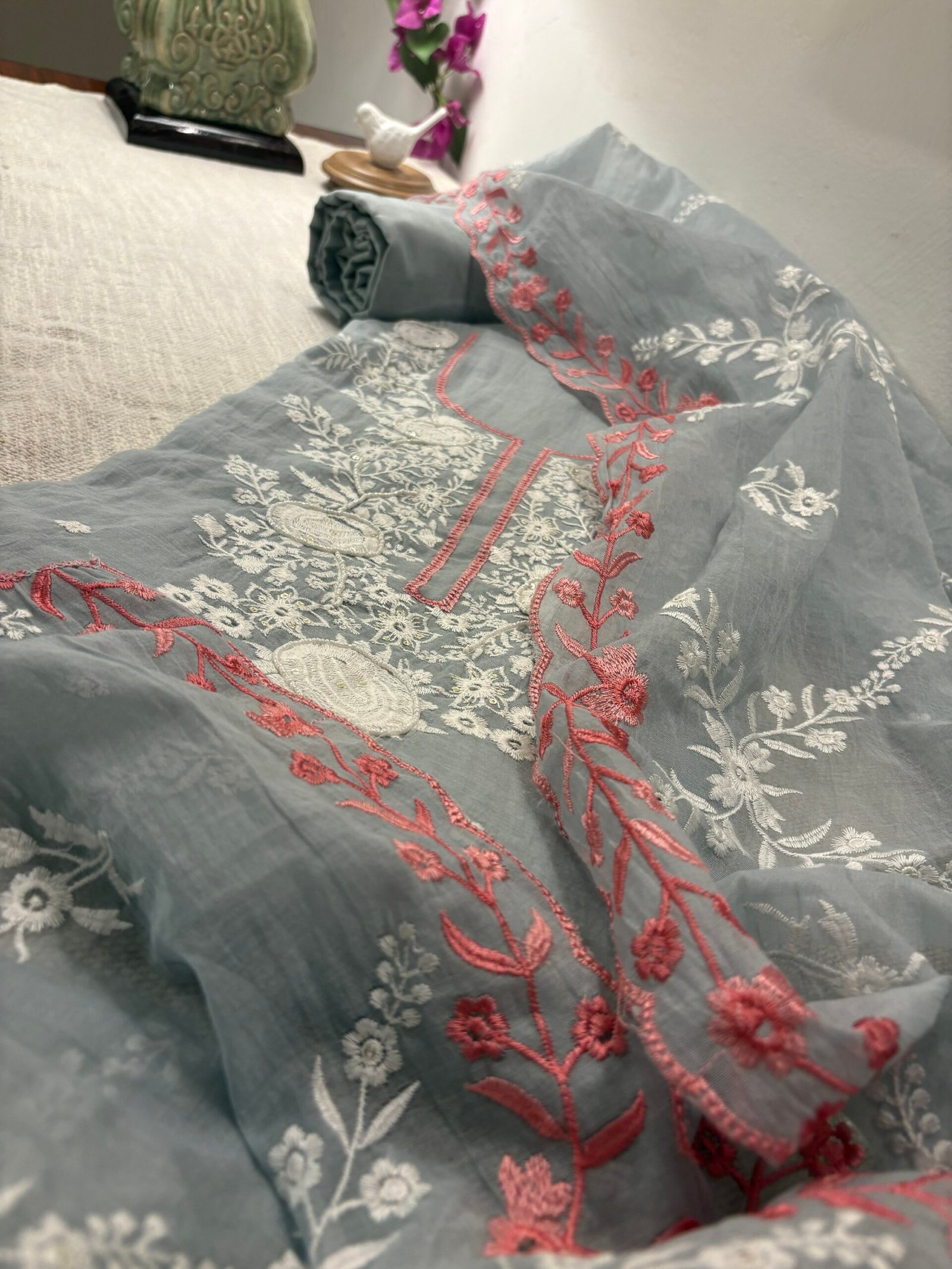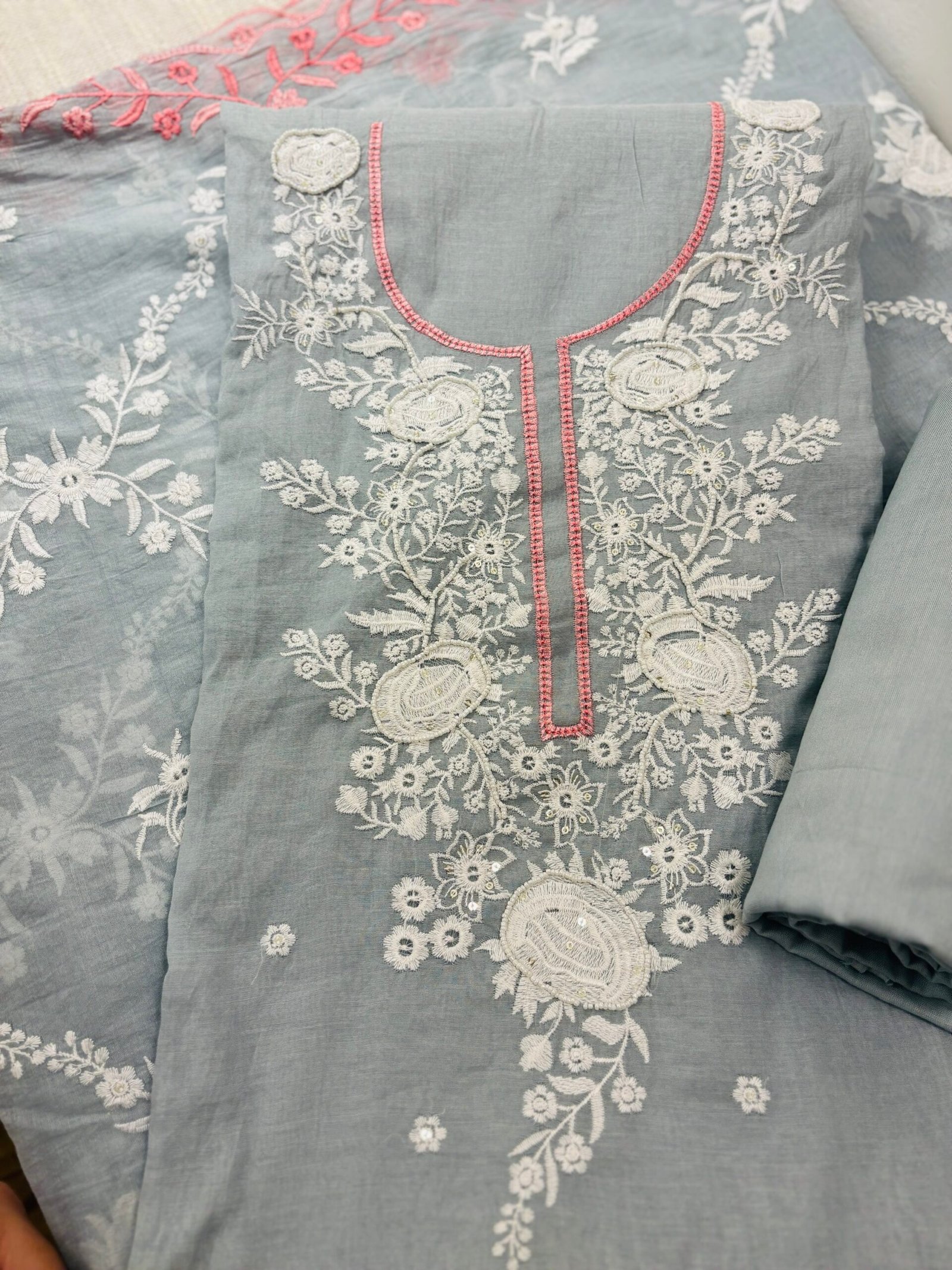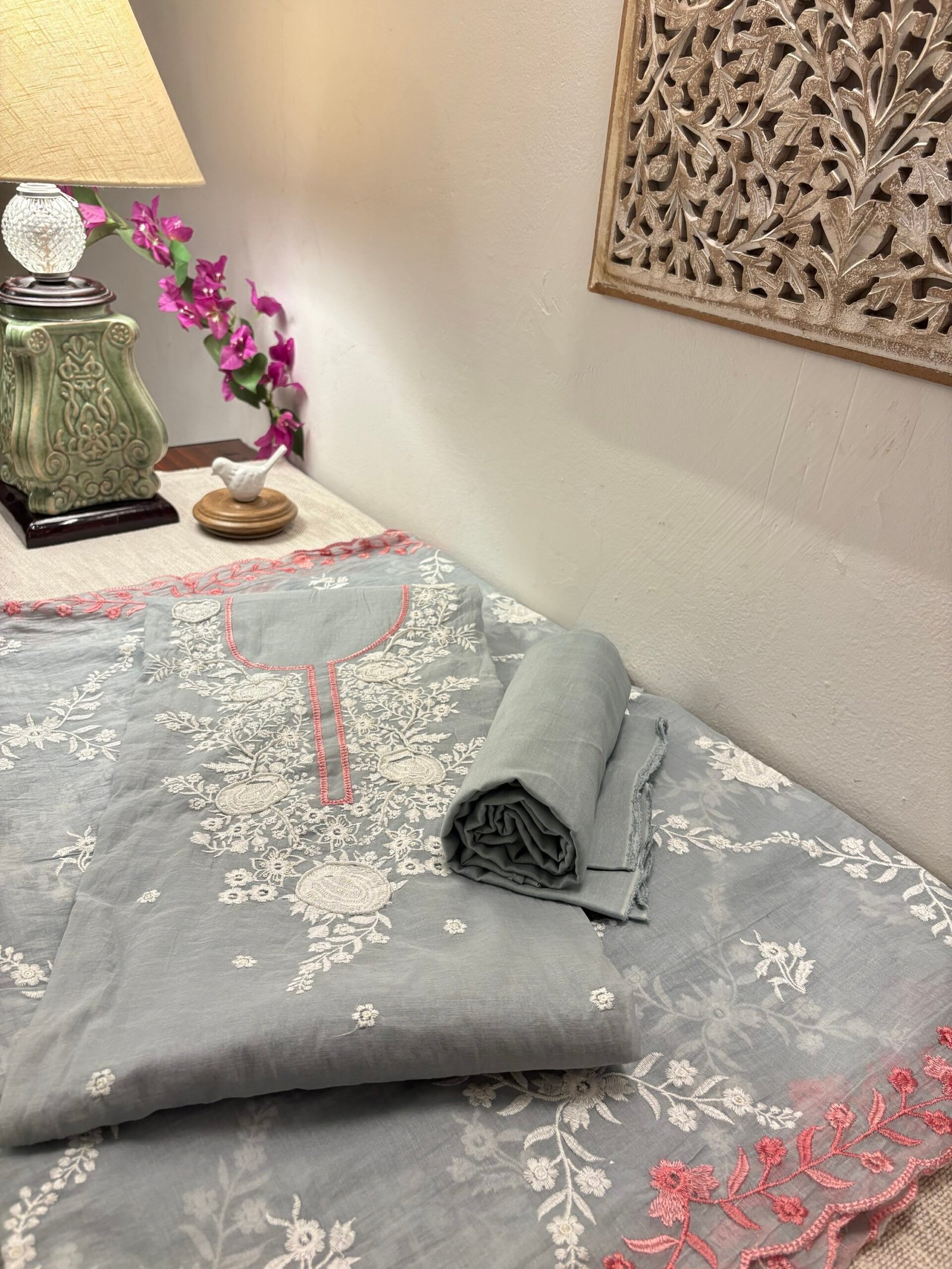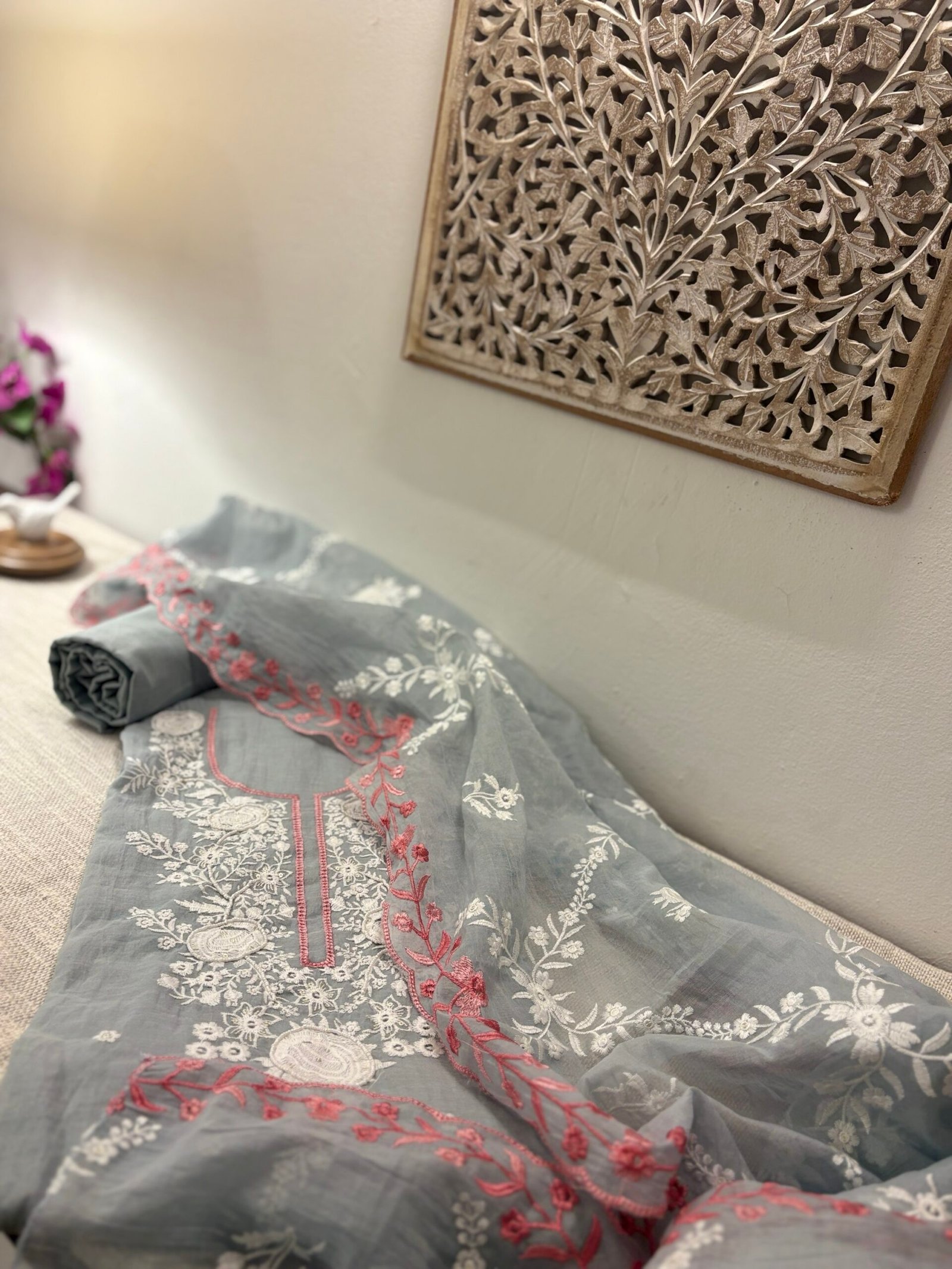 Unstitched Salwar Kameez Collection on Mul Chanderi Mul with Embroidery by Ikhtirah.
