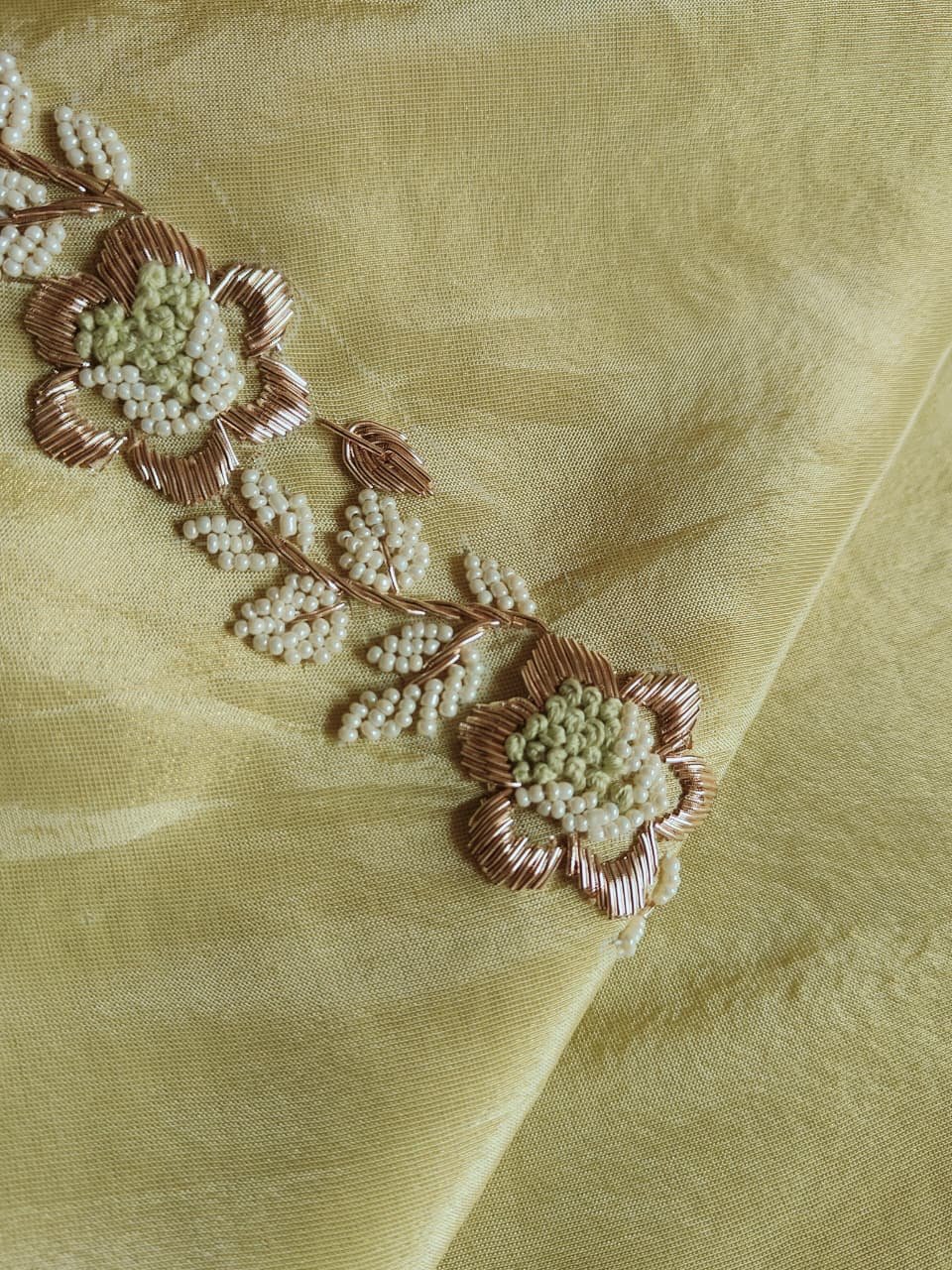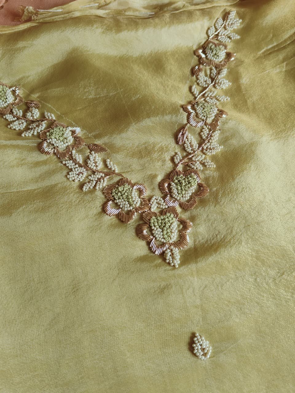 Kameez: Hand Embroidered Pure Shimmer Tissue 2.5 mtrs (3 booties on sleeves)