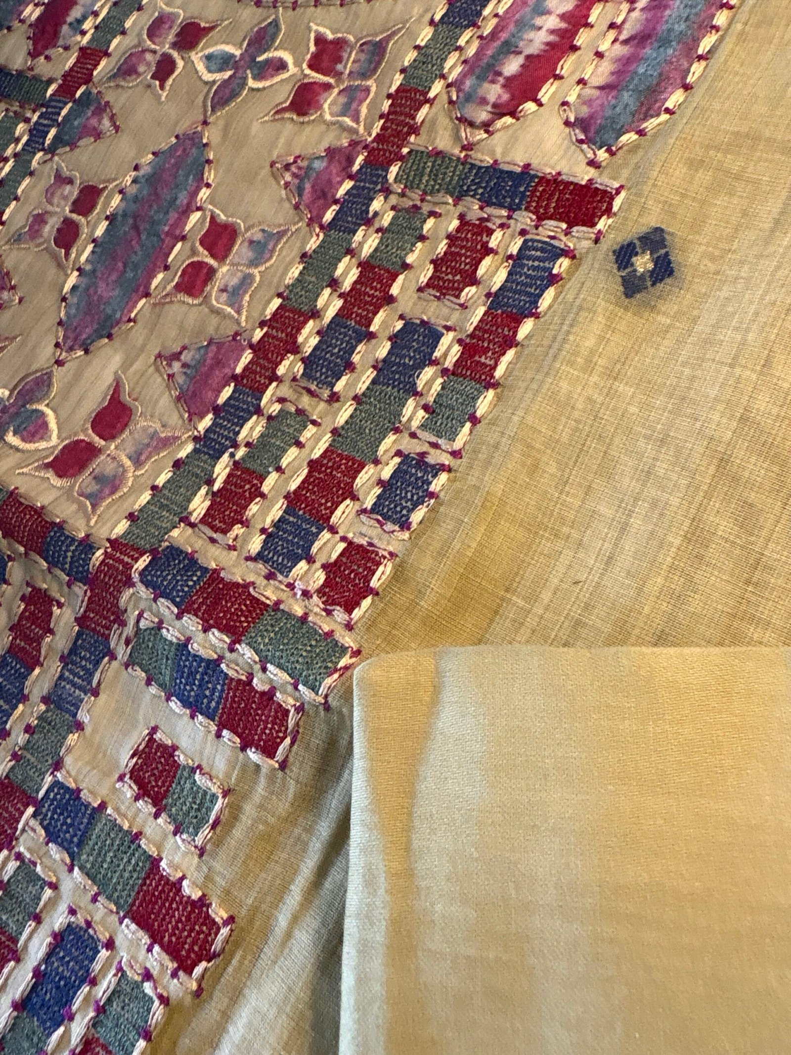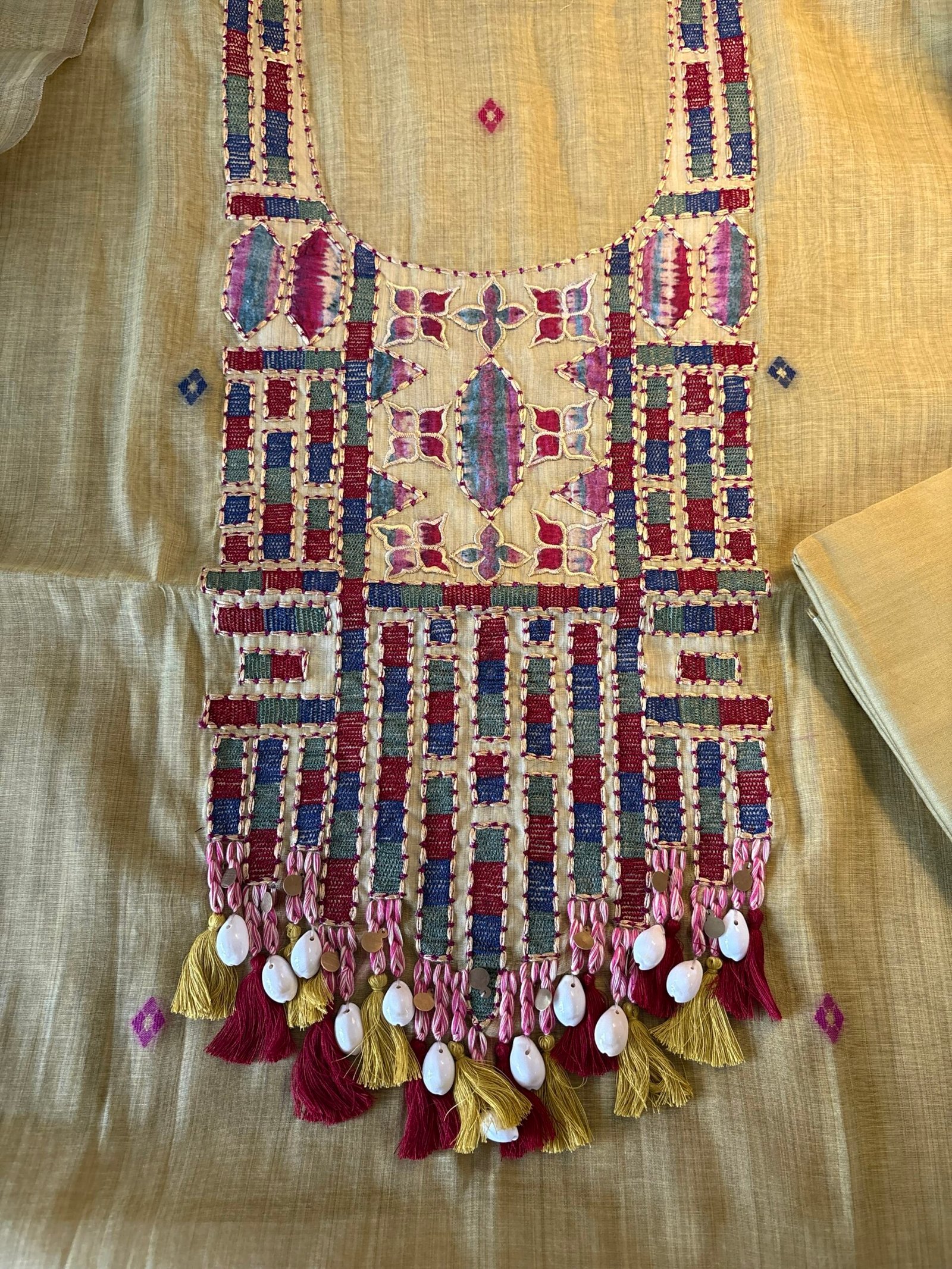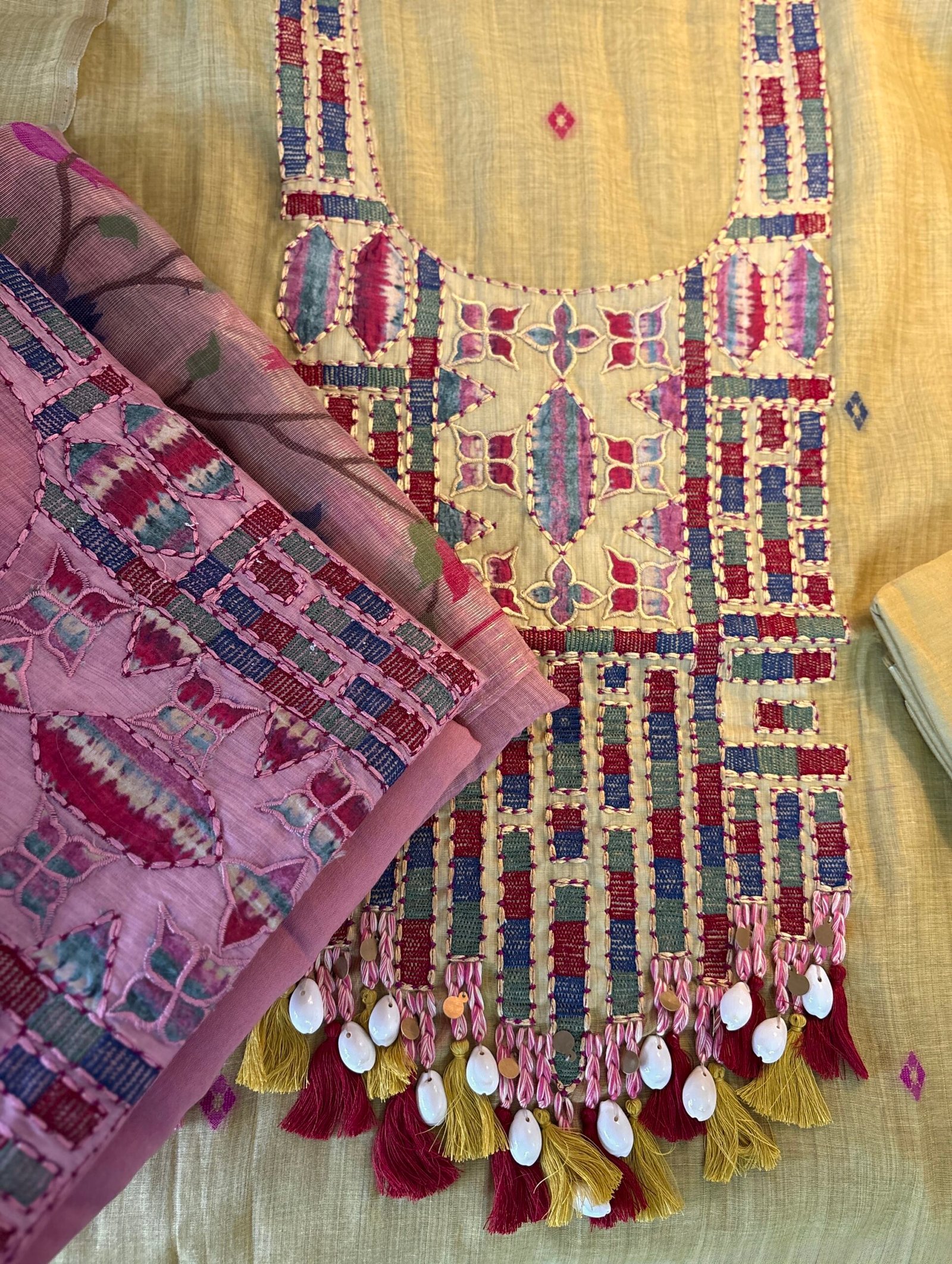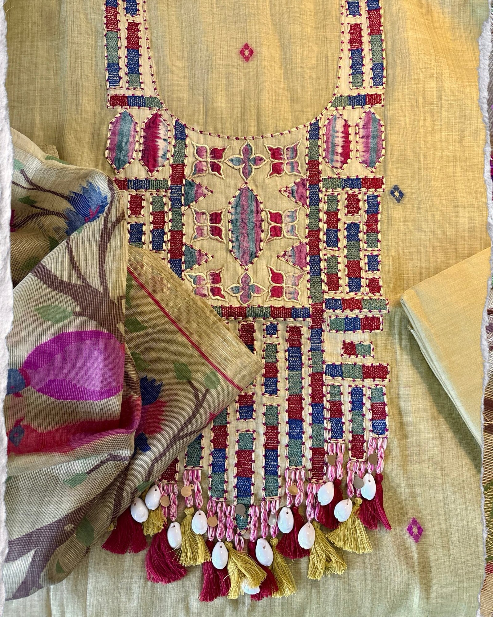 Kameez: Embroidered and applique worked Soft Chanderi Woven Jamdani with real shells